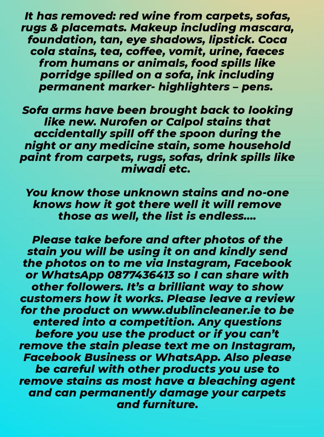 Please take before and after photos of the stain you will be using it on and kindly send the photos on to me via Instagram, Facebook or WhatsApp 0877436413 so I can share with other followers. It’s a brilliant way to show customers how it works. Please leave a review for the product on www.dublincleaner.ie to be entered into a competition. Any questions before you use the product or if you can’t remove the stain please text me on Instagram, Facebook Business or WhatsApp. Also please be careful with other products you use to remove stains as most have a bleaching agent and can permanently damage your carpets and furniture.